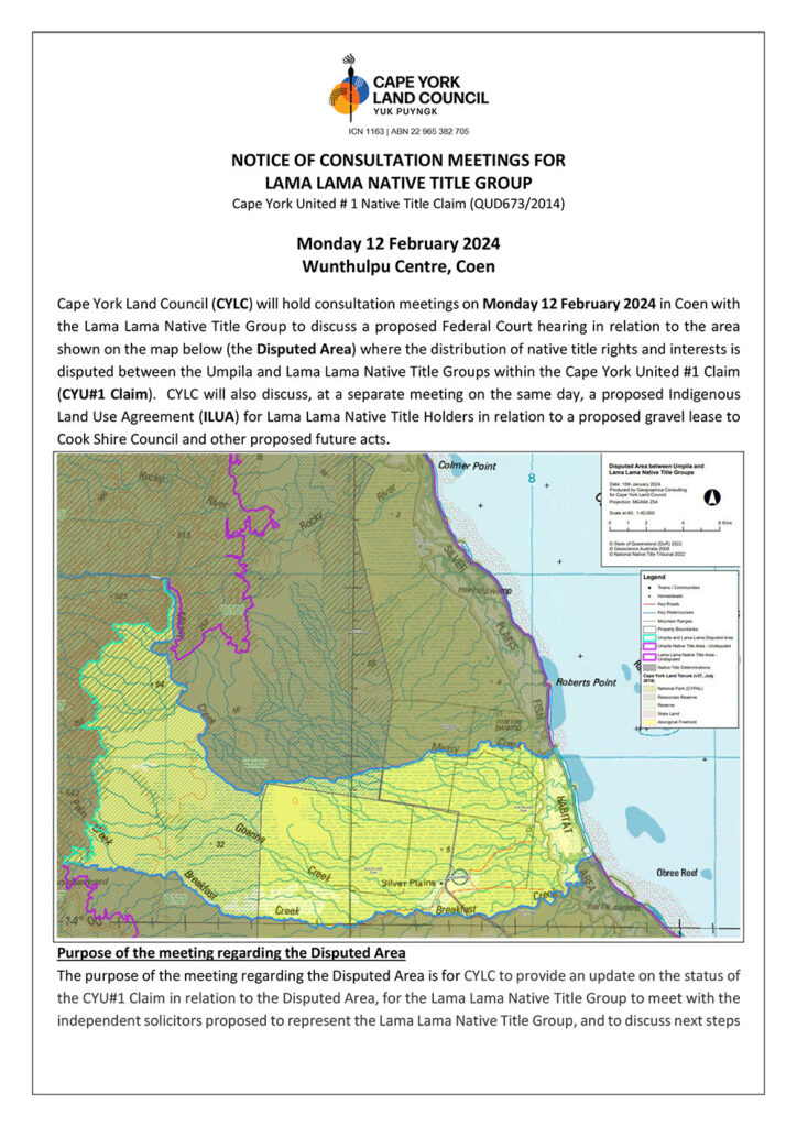 Cape York Land Council (CYLC) will hold consultation meetings on Monday 12 February 2024 in Coen with the Lama Lama Native Title Group to discuss a proposed Federal Court hearing in relation to the area shown on the map below (the Disputed Area) where the distribution of native title rights and interests is disputed between the Umpila and Lama Lama Native Title Groups within the Cape York United #1 Claim (CYU#1 Claim). CYLC will also discuss, at a separate meeting on the same day, a proposed Indigenous Land Use Agreement (ILUA) for Lama Lama Native Title Holders in relation to a proposed gravel lease to Cook Shire Council and other proposed future acts.