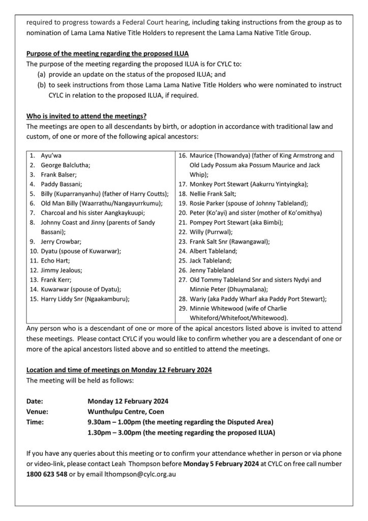 Any person who is a descendant of one or more of the apical ancestors listed above is invited to attend these meetings. Please contact CYLC if you would like to confirm whether you are a descendant of one or more of the apical ancestors listed above and so entitled to attend the meetings.