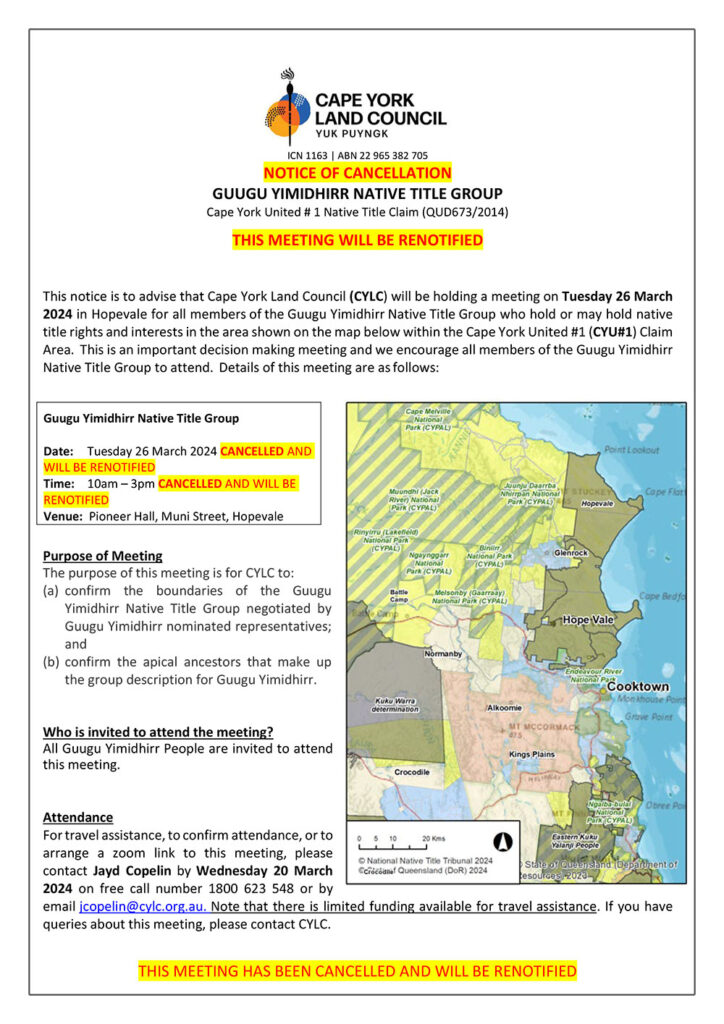 This notice is to advise that Cape York Land Council (CYLC) will be holding a meeting on Tuesday 26 March 2024 in Hopevale for all members of the Guugu Yimidhirr Native Title Group who hold or may hold native title rights and interests in the area shown on the map below within the Cape York United #1 (CYU#1) Claim Area. This is an important decision making meeting and we encourage all members of the Guugu Yimidhirr Native Title Group to attend. Details of this meeting are as follows: