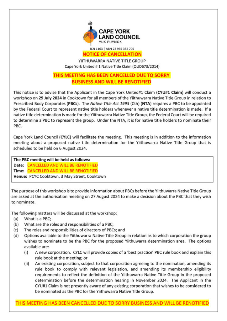 This notice is to advise that the Applicant in the Cape York United#1 Claim (CYU#1 Claim) will conduct a workshop on 29 July 2024 in Cooktown for all members of the Yiithuwarra Native Title Group in relation to Prescribed Body Corporates (PBCs). The Native Title Act 1993 (Cth) (NTA) requires a PBC to be appointed by the Federal Court to represent native title holders whenever a native title determination is made. If a native title determination is made for the Yiithuwarra Native Title Group, the Federal Court will be required to determine a PBC to represent the group. Under the NTA, it is for native title holders to nominate their PBC.