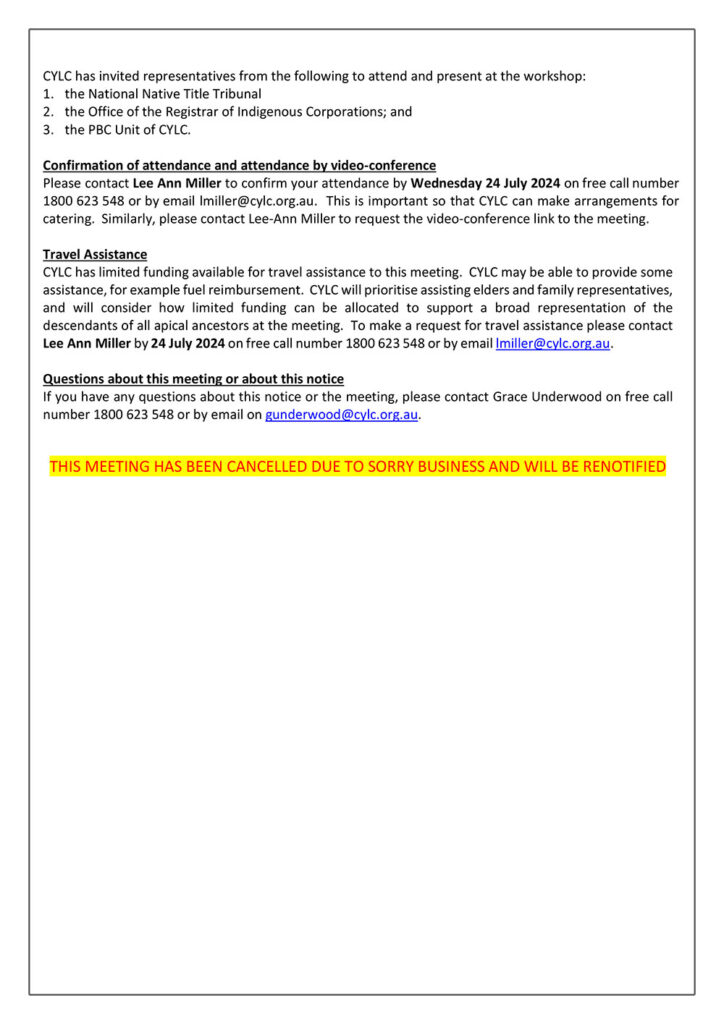 CYLC has limited funding available for travel assistance to this meeting. CYLC may be able to provide some assistance, for example fuel reimbursement. CYLC will prioritise assisting elders and family representatives, and will consider how limited funding can be allocated to support a broad representation of the descendants of all apical ancestors at the meeting. To make a request for travel assistance please contact Lee Ann Miller by 24 July 2024 on free call number 1800 623 548 or by email lmiller@cylc.org.au.