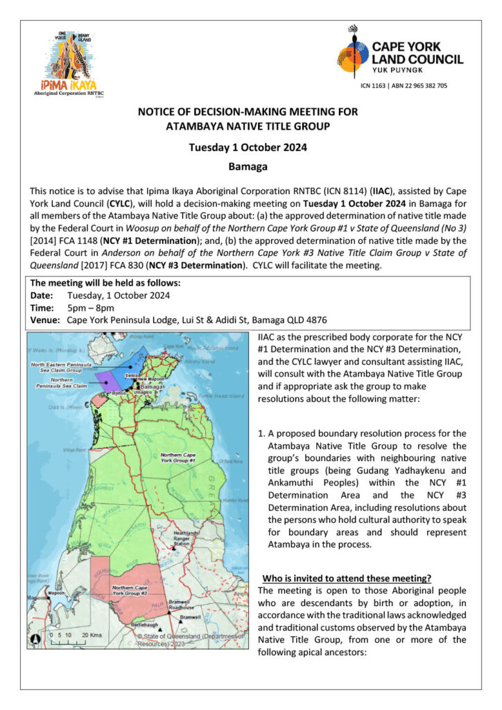This notice is to advise that Ipima Ikaya Aboriginal Corporation RNTBC (ICN 8114) (IIAC), assisted by Cape York Land Council (CYLC), will hold a decision-making meeting on Tuesday 1 October 2024 in Bamaga for all members of the Atambaya Native Title Group about: (a) the approved determination of native title made by the Federal Court in Woosup on behalf of the Northern Cape York Group #1 v State of Queensland (No 3) [2014] FCA 1148 (NCY #1 Determination); and, (b) the approved determination of native title made by the Federal Court in Anderson on behalf of the Northern Cape York #3 Native Title Claim Group v State of Queensland [2017] FCA 830 (NCY #3 Determination). CYLC will facilitate the meeting.