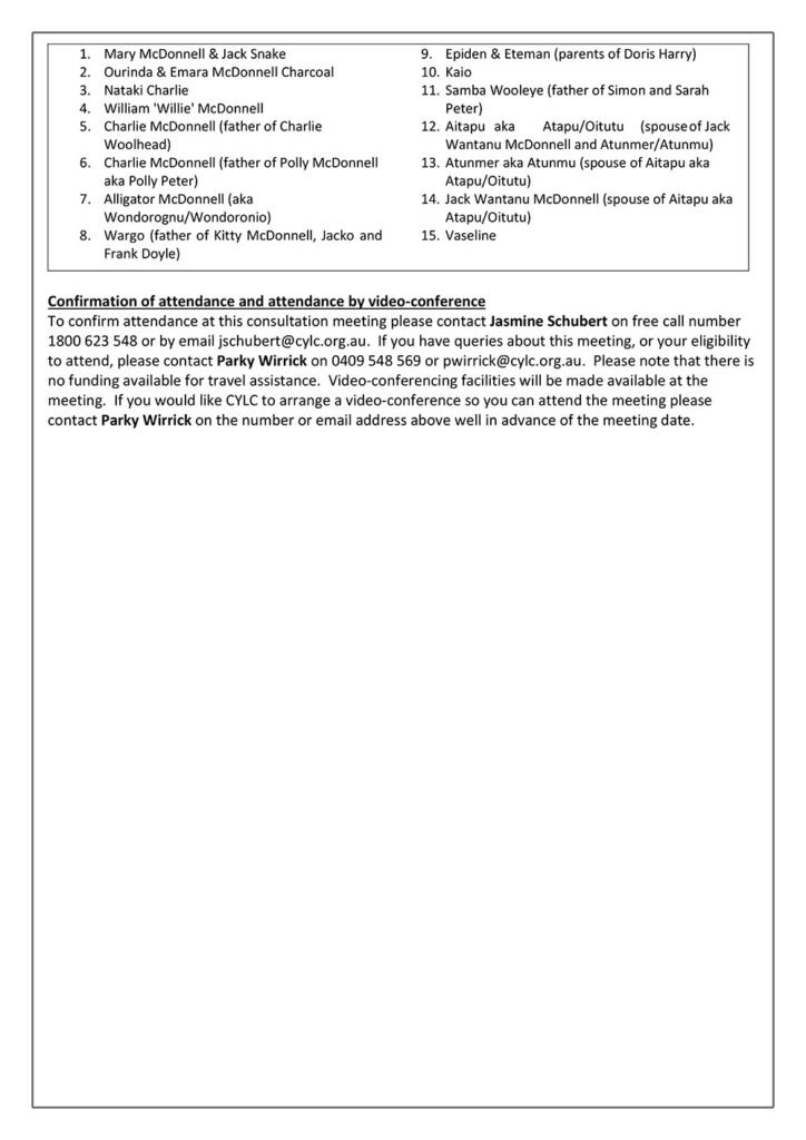 To confirm attendance at this consultation meeting please contact Jasmine Schubert on free call number 1800 623 548 or by email jschubert@cylc.org.au. If you have queries about this meeting, or your eligibility to attend, please contact Parky Wirrick on 0409 548 569 or pwirrick@cylc.org.au. Please note that there is no funding available for travel assistance. Video-conferencing facilities will be made available at the meeting. If you would like CYLC to arrange a video-conference so you can attend the meeting please contact Parky Wirrick on the number or email address above well in advance of the meeting date.