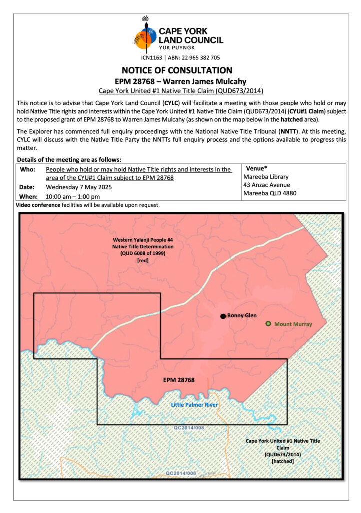 This notice is to advise that Cape York Land Council (CYLC) will facilitate a meeting with those people who hold or may hold Native Title Act rights and interests within the Cape York United #1 Native Title Claim (QUD673/2014) (CYU#1 Claim) subject to the proposed grant of EPM 28768 to Warren James Mulcahy (as shown on the map below in the hatched area).