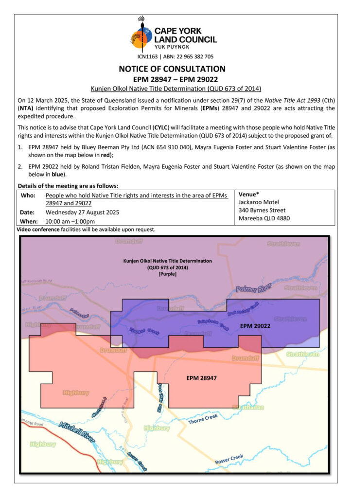 On 12 March 2025, the State of Queensland issued a notification under section 29(7) of the Native Title Act 1993 (Cth) (NTA) identifying that proposed Exploration Permits for Minerals (EPMs) 28947 and 29022 are acts attracting the expedited procedure.