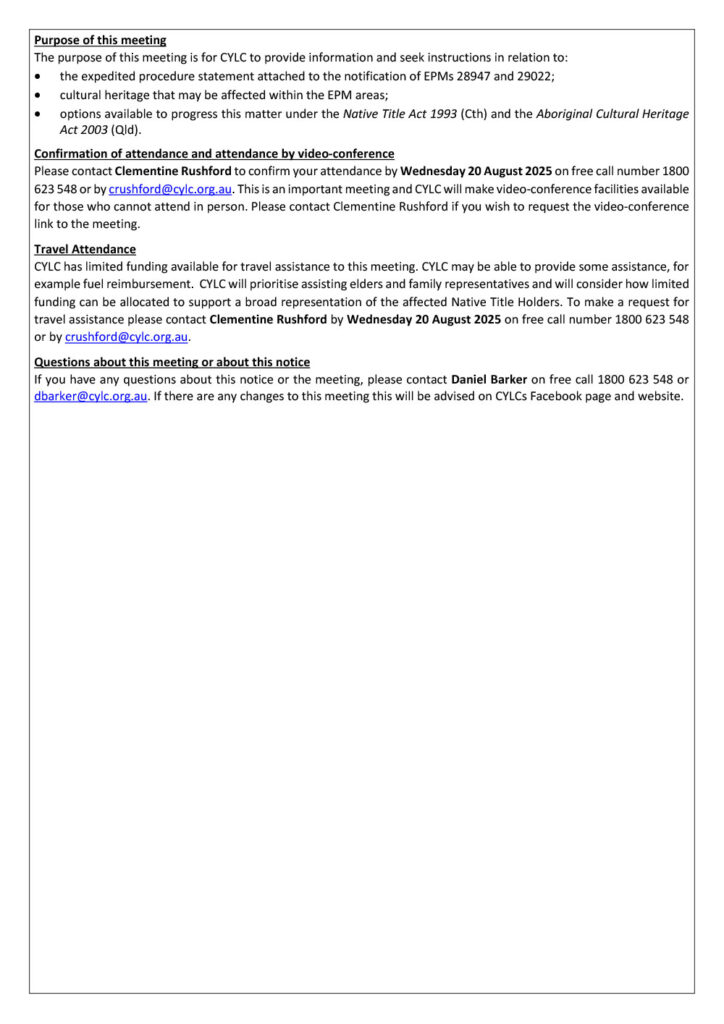 CYLC has limited funding available for travel assistance to this meeting. CYLC may be able to provide some assistance, for example fuel reimbursement. CYLC will prioritise assisting elders and family representatives and will consider how limited funding can be allocated to support a broad representation of the affected Native Title Holders. To make a request for travel assistance please contact Clementine Rushford by Wednesday 20 August 2025 on free call number 1800 623 548 or by crushford@cylc.org.au.