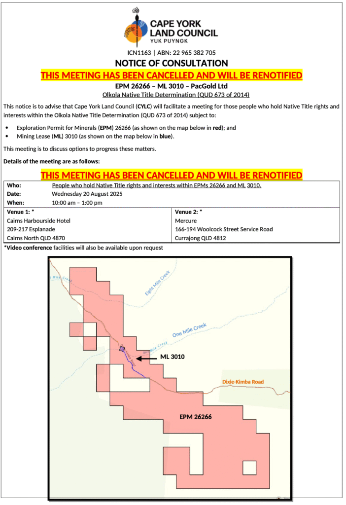 This notice is to advise that Cape York Land Council (CYLC) will facilitate a meeting for those people who hold Native Title rights and interests within the Olkola Native Title Determination (QUD 673 of 2014) subject to: