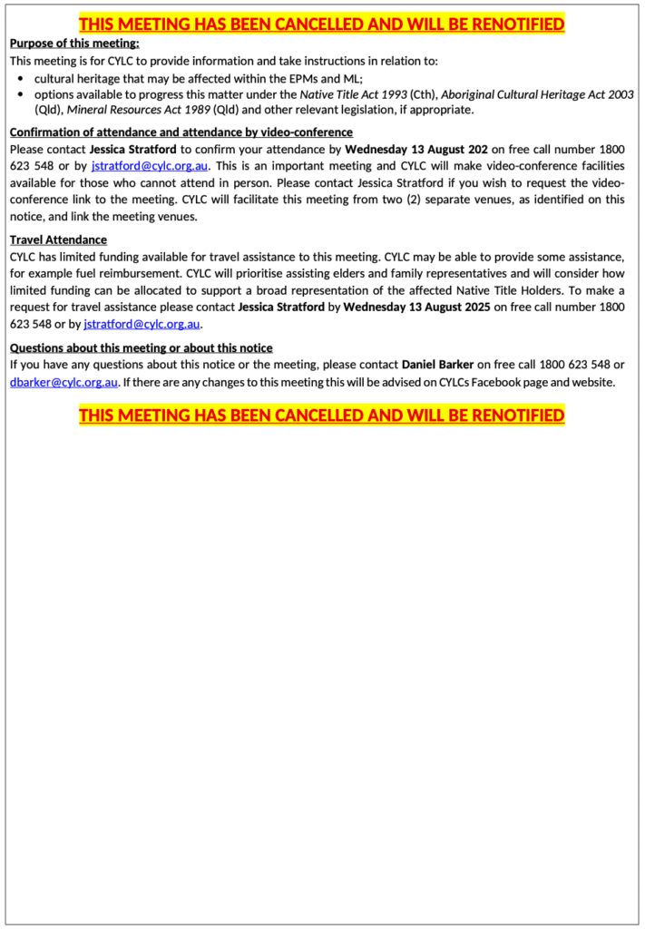 CYLC has limited funding available for travel assistance to this meeting. CYLC may be able to provide some assistance, for example fuel reimbursement. CYLC will prioritise assisting elders and family representatives and will consider how limited funding can be allocated to support a broad representation of the affected Native Title Holders. To make a request for travel assistance please contact Jessica Stratford by Wednesday 13 August 2025 on free call number 1800 623 548 or by jstratford@cylc.org.au.