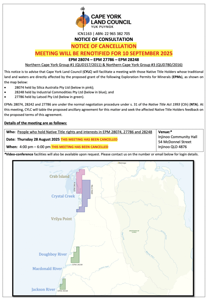 This notice is to advise that Cape York Land Council (CYLC) will facilitate a meeting with those Native Title Holders whose traditional land and waters are directly affected by the proposed grant of the following Exploration Permits for Minerals (EPMs), as shown on the map below:
