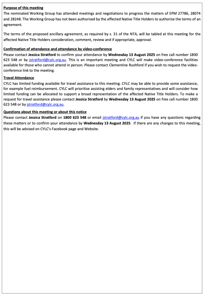 CYLC has limited funding available for travel assistance to this meeting. CYLC may be able to provide some assistance, for example fuel reimbursement. CYLC will prioritise assisting elders and family representatives and will consider how limited funding can be allocated to support a broad representation of the affected Native Title Holders. To make a request for travel assistance please contact Jessica Stratford by Wednesday 13 August 2025 on free call number 1800 623 548 or by jstratford@cylc.org.au.
