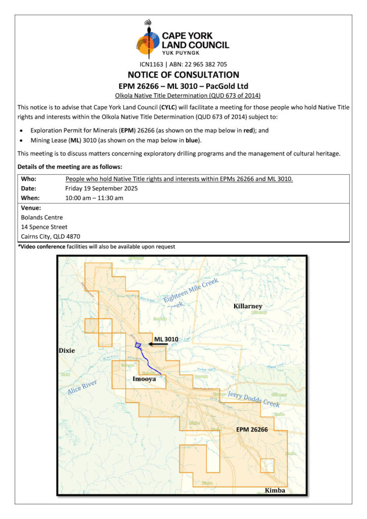 This notice is to advise that Cape York Land Council (CYLC) will facilitate a meeting for those people who hold Native Title rights and interests within the Olkola Native Title Determination (QUD 673 of 2014) subject to: