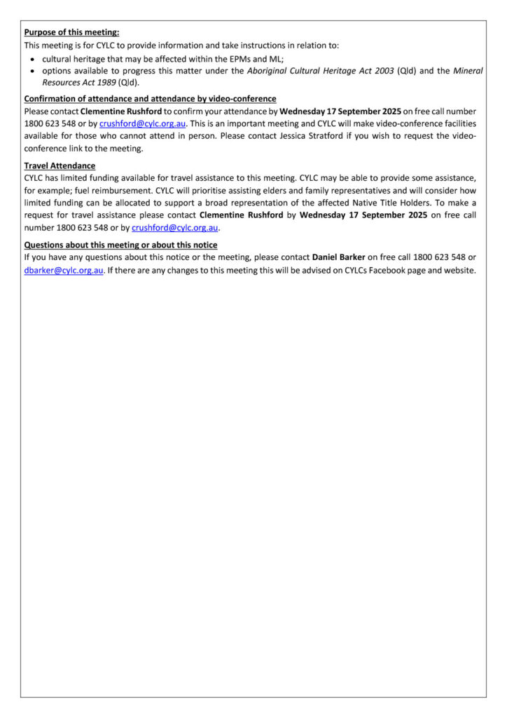 CYLC has limited funding available for travel assistance to this meeting. CYLC may be able to provide some assistance, for example; fuel reimbursement. CYLC will prioritise assisting elders and family representatives and will consider how limited funding can be allocated to support a broad representation of the affected Native Title Holders. To make a request for travel assistance please contact Clementine Rushford by Wednesday 17 September 2025 on free call number 1800 623 548 or by crushford@cylc.org.au.