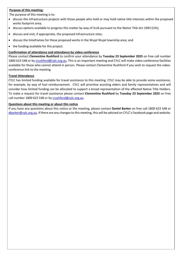 CYLC has limited funding available for travel assistance to this meeting. CYLC may be able to provide some assistance, for example, by way of fuel reimbursement. CYLC will prioritise assisting elders and family representatives and will consider how limited funding can be allocated to support a broad representation of the affected Native Title Holders. To make a request for travel assistance please contact Clementine Rushford by Tuesday 23 September 2025 on free call number 1800 623 548 or by email at crushford@cylc.org.au.