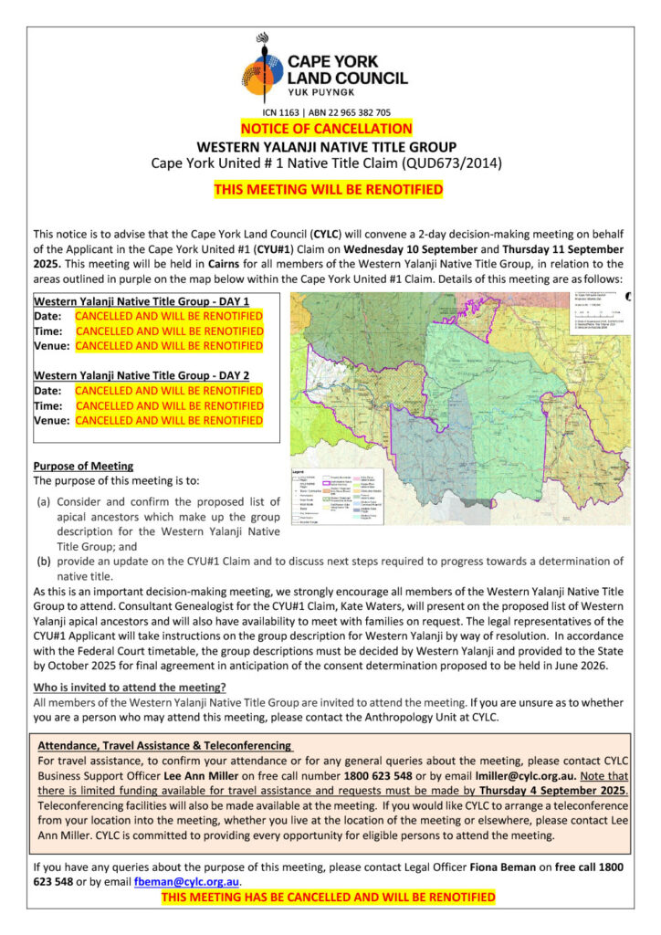 All members of the Western Yalanji Native Title Group are invited to attend the meeting. If you are unsure as to whether you are a person who may attend this meeting, please contact the Anthropology Unit at CYLC.