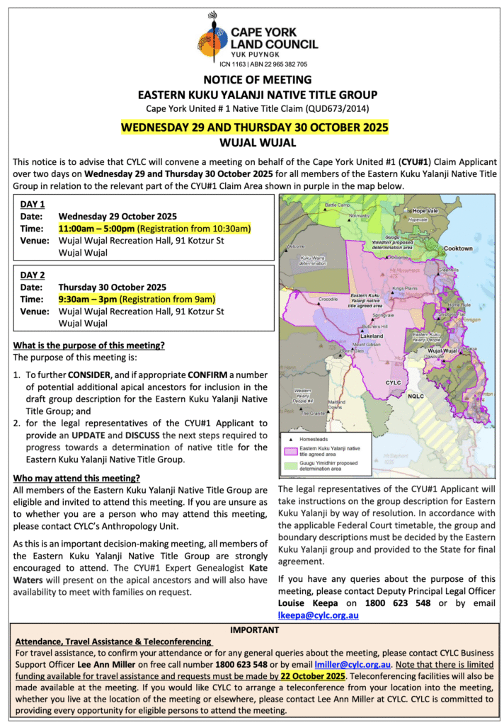 All members of the Eastern Kuku Yalanji Native Title Group are eligible and invited to attend this meeting. If you are unsure as to whether you are a person who may attend this meeting, please contact CYLC’s Anthropology Unit.