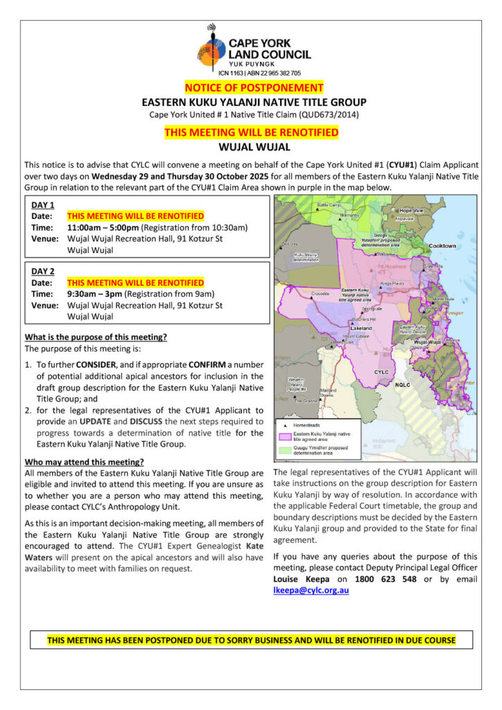 All members of the Eastern Kuku Yalanji Native Title Group are eligible and invited to attend this meeting. If you are unsure as to whether you are a person who may attend this meeting, please contact CYLC’s Anthropology Unit.