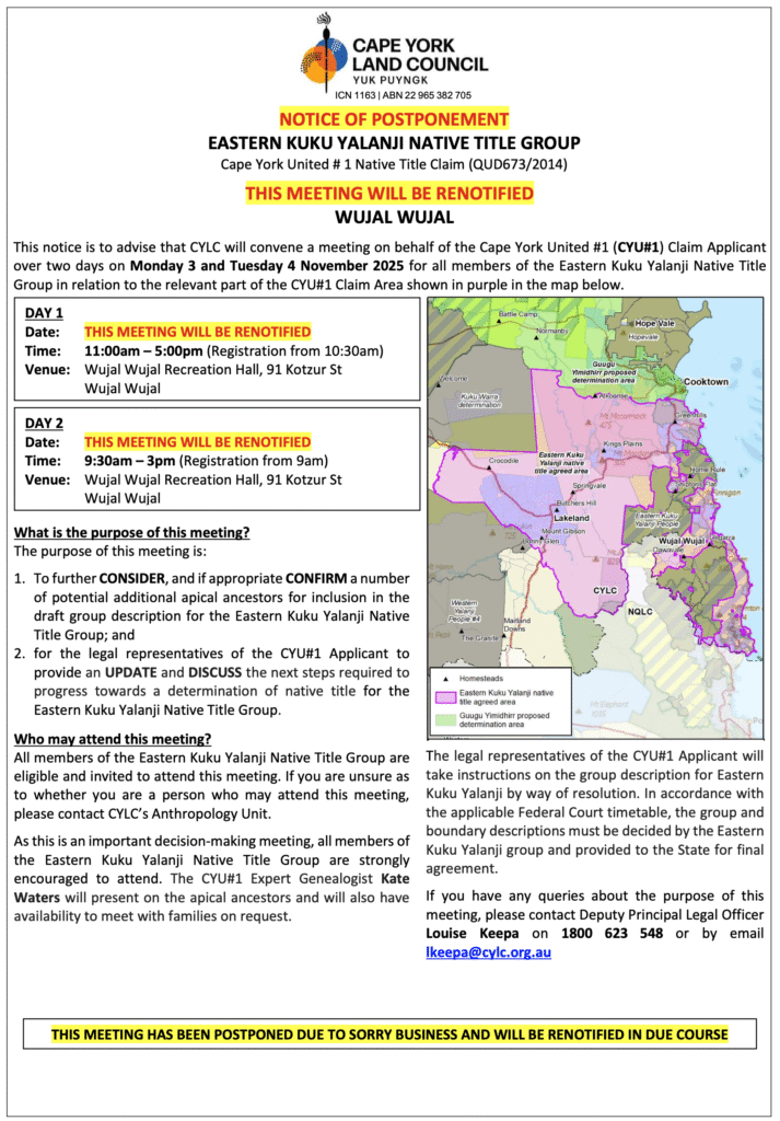 All members of the Eastern Kuku Yalanji Native Title Group are eligible and invited to attend this meeting. If you are unsure as to whether you are a person who may attend this meeting, please contact CYLC’s Anthropology Unit.