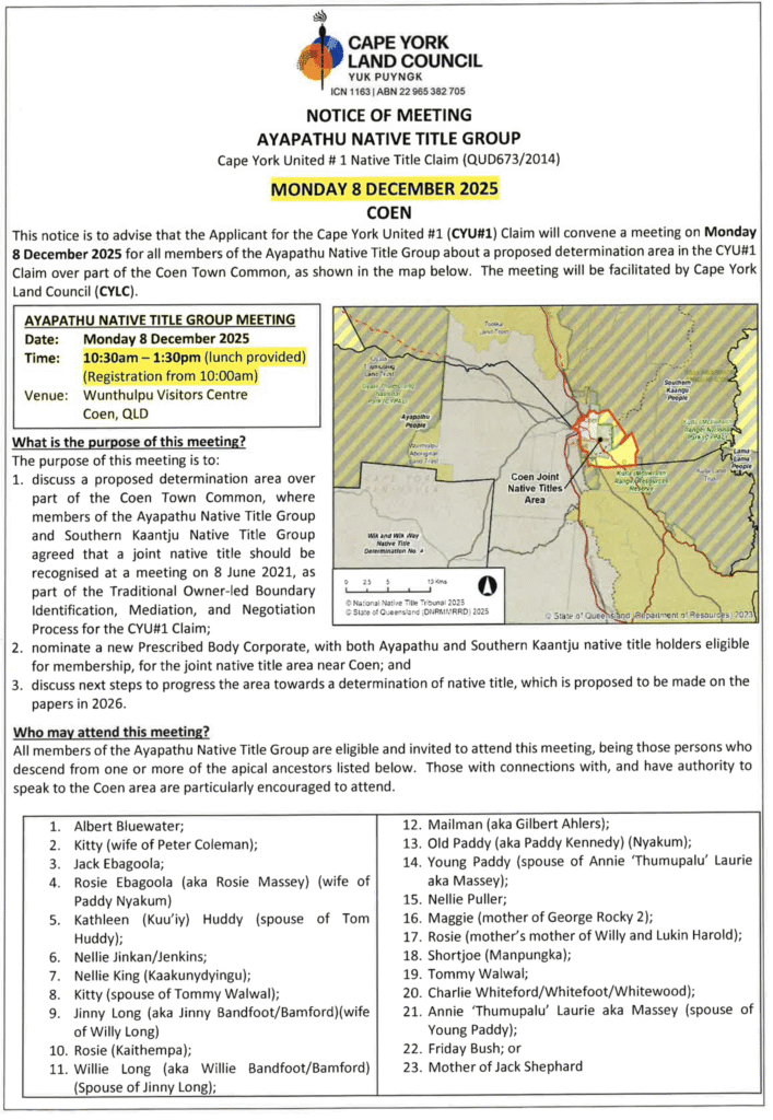 This notice is to advise that the Applicant for the Cape York United #1 (CYU#1) Claim will convene a meeting on Monday 8 December 2025 for all members of the Ayapathu Native Title Group about a proposed determination area in the CYU#1 Claim over part of the Coen Town Common, as shown in the map below. The meeting will be facilitated by Cape York Land Council (CYLC).