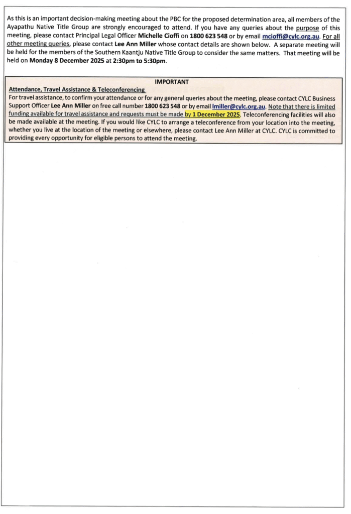 As this is an important decision-making meeting about the PBC for the proposed determination area, all members of the Ayapathu Native Title Group are strongly encouraged to attend. If you have any queries about the purpose of this meeting, please contact Principal Legal Officer Michelle Cioffi on 1800 623 548 or by email mcioffi@cylc.org.au. For all other meeting queries, please contact Lee Ann Miller whose contact details are shown below. A separate meeting will be held for the members of the Southern Kaantju Native Title Group to consider the same matters. That meeting will be held on Monday 8 December 2025 at 2:30pm to 5:30pm.