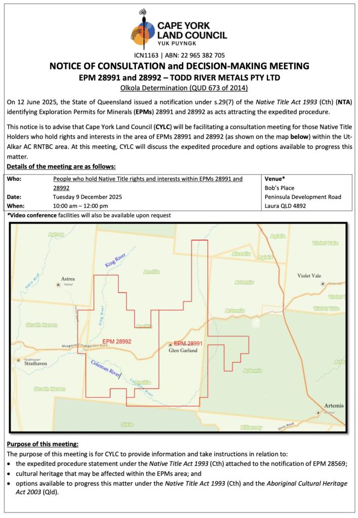 On 12 June 2025, the State of Queensland issued a notification under s.29(7) of the Native Title Act 1993 (Cth) (NTA) identifying Exploration Permits for Minerals (EPMs) 28991 and 28992 as acts attracting the expedited procedure.