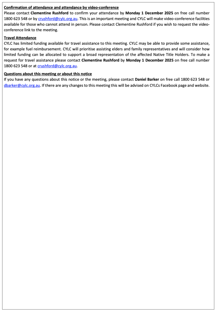 CYLC has limited funding available for travel assistance to this meeting. CYLC may be able to provide some assistance, for example fuel reimbursement. CYLC will prioritise assisting elders and family representatives and will consider how limited funding can be allocated to support a broad representation of the affected Native Title Holders. To make a request for travel assistance please contact Clementine Rushford by Monday 1 December 2025 on free call number 1800 623 548 or at crushford@cylc.org.au.