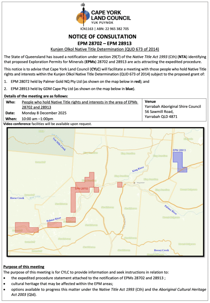 The State of Queensland has issued a notification under section 29(7) of the Native Title Act 1993 (Cth) (NTA) identifying that proposed Exploration Permits for Minerals (EPMs) 28702 and 28913 are acts attracting the expedited procedure.