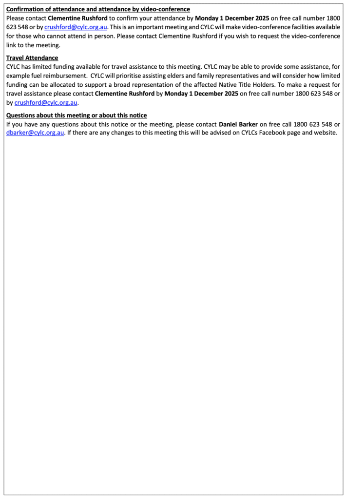 CYLC has limited funding available for travel assistance to this meeting. CYLC may be able to provide some assistance, for example fuel reimbursement. CYLC will prioritise assisting elders and family representatives and will consider how limited funding can be allocated to support a broad representation of the affected Native Title Holders. To make a request for travel assistance please contact Clementine Rushford by Monday 1 December 2025 on free call number 1800 623 548 or by crushford@cylc.org.au.