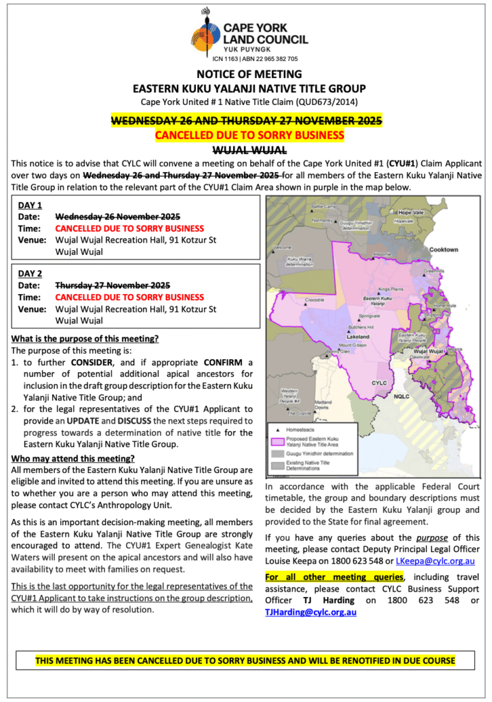 All members of the Eastern Kuku Yalanji Native Title Group are eligible and invited to attend this meeting. If you are unsure as to whether you are a person who may attend this meeting, please contact CYLC’s Anthropology Unit.