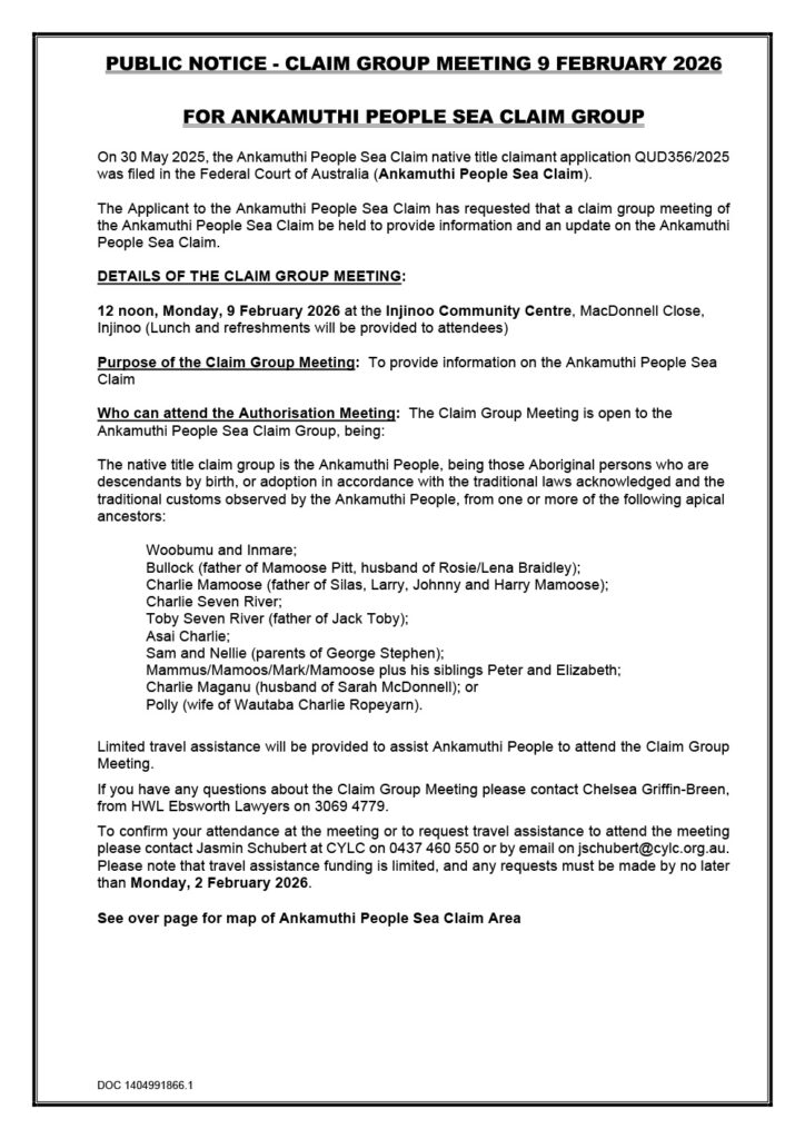 Limited travel assistance will be provided to assist Ankamuthi People to attend the Claim Group Meeting.