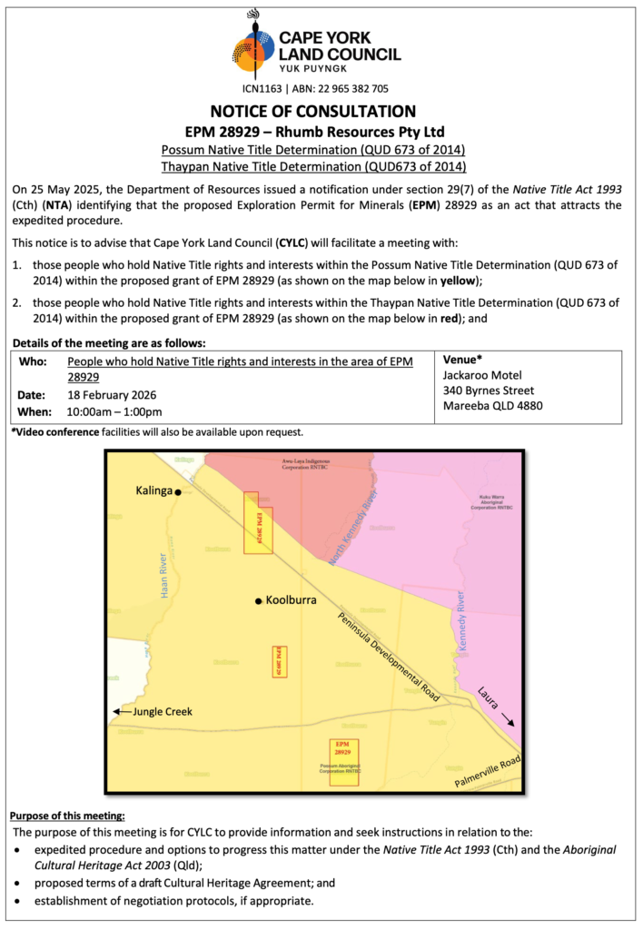 On 25 May 2025, the Department of Resources issued a notification under section 29(7) of the Native Title Act 1993 (Cth) (NTA) identifying that the proposed Exploration Permit for Minerals (EPM) 28929 as an act that attracts the expedited procedure.