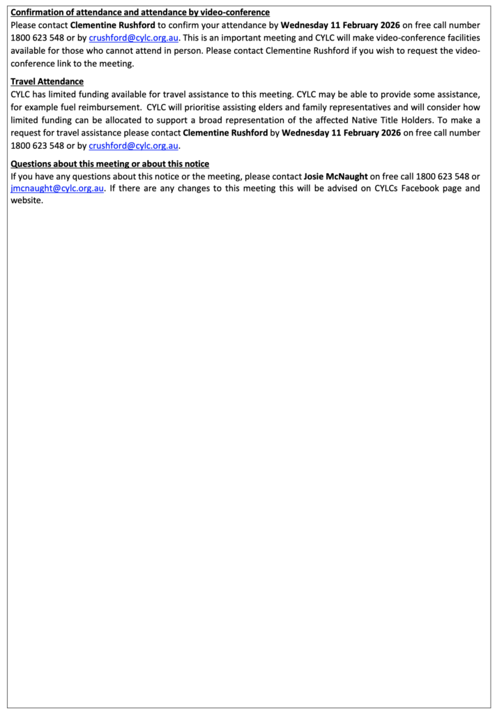 CYLC has limited funding available for travel assistance to this meeting. CYLC may be able to provide some assistance, for example fuel reimbursement. CYLC will prioritise assisting elders and family representatives and will consider how limited funding can be allocated to support a broad representation of the affected Native Title Holders. To make a request for travel assistance please contact Clementine Rushford by Wednesday 11 February 2026 on free call number 1800 623 548 or by crushford@cylc.org.au.