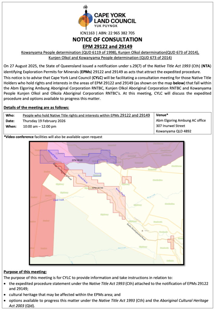 This notice is to advise that Cape York Land Council (CYLC) will be facilitating a consultation meeting for those Native Title Holders who hold rights and interests in the areas of EPM 29122 and 29149 (as shown on the map below) that fall within the Abm Elgoring Ambung Aboriginal Corporation RNTBC, Kunjen Olkol Aboriginal Corporation RNTBC and Kowanyama People Kunjen Olkol and Olkola Aboriginal Corporation RNTBC’s. At this meeting, CYLC will discuss the expedited procedure and options available to progress this matter.