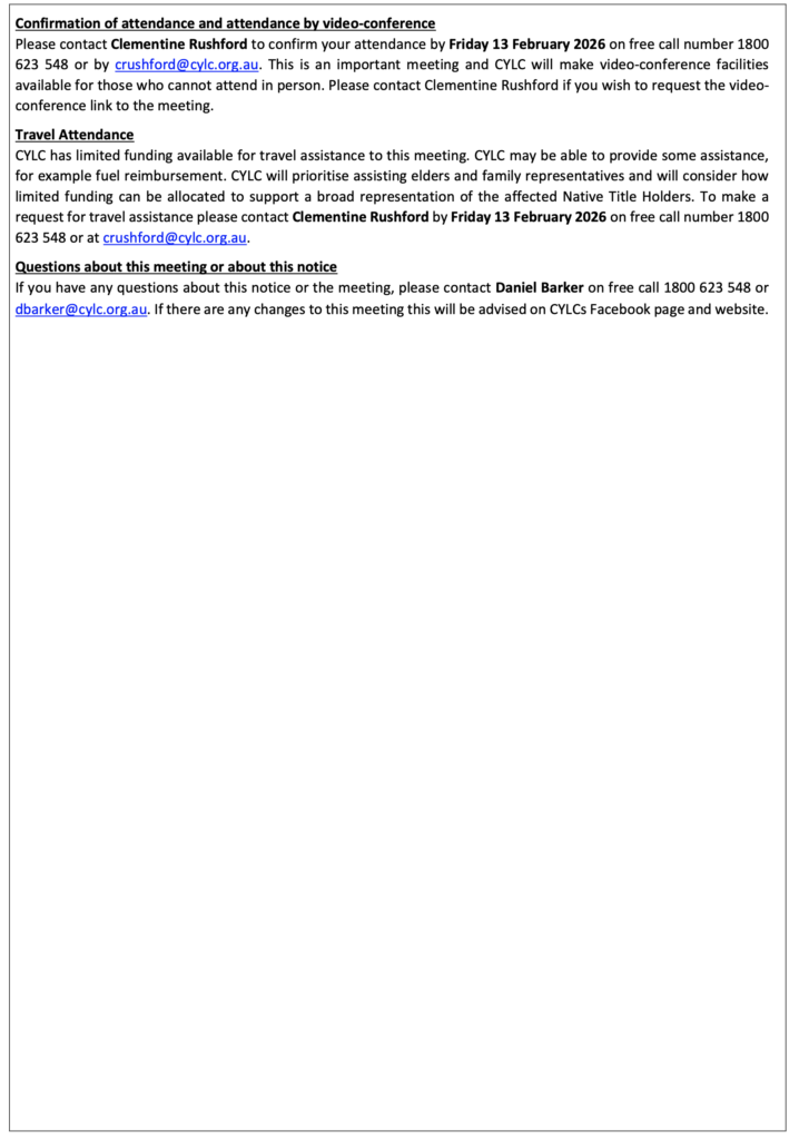 CYLC has limited funding available for travel assistance to this meeting. CYLC may be able to provide some assistance, for example fuel reimbursement. CYLC will prioritise assisting elders and family representatives and will consider how limited funding can be allocated to support a broad representation of the affected Native Title Holders. To make a request for travel assistance please contact Clementine Rushford by Friday 13 February 2026 on free call number 1800 623 548 or at crushford@cylc.org.au.