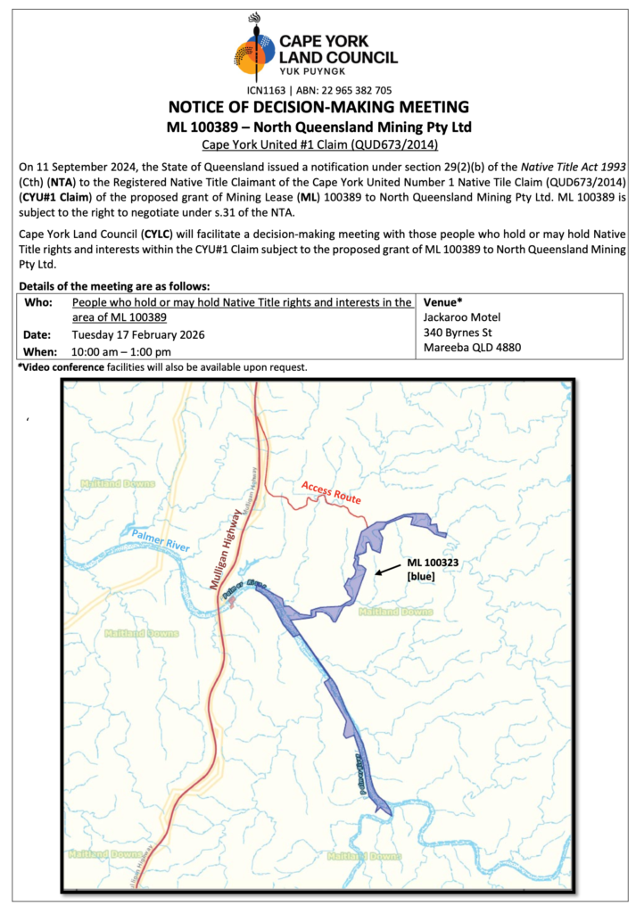 Cape York Land Council (CYLC) will facilitate a decision-making meeting with those people who hold or may hold Native Title rights and interests within the CYU#1 Claim subject to the proposed grant of ML 100389 to North Queensland Mining Pty Ltd.