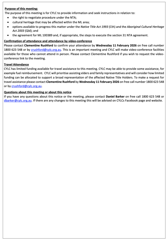 CYLC has limited funding available for travel assistance to this meeting. CYLC may be able to provide some assistance, for example fuel reimbursement. CYLC will prioritise assisting elders and family representatives and will consider how limited funding can be allocated to support a broad representation of the affected Native Title Holders. To make a request for travel assistance please contact Clementine Rushford by Wednesday 11 February 2026 on free call number 1800 623 548 or by crushford@cylc.org.au.