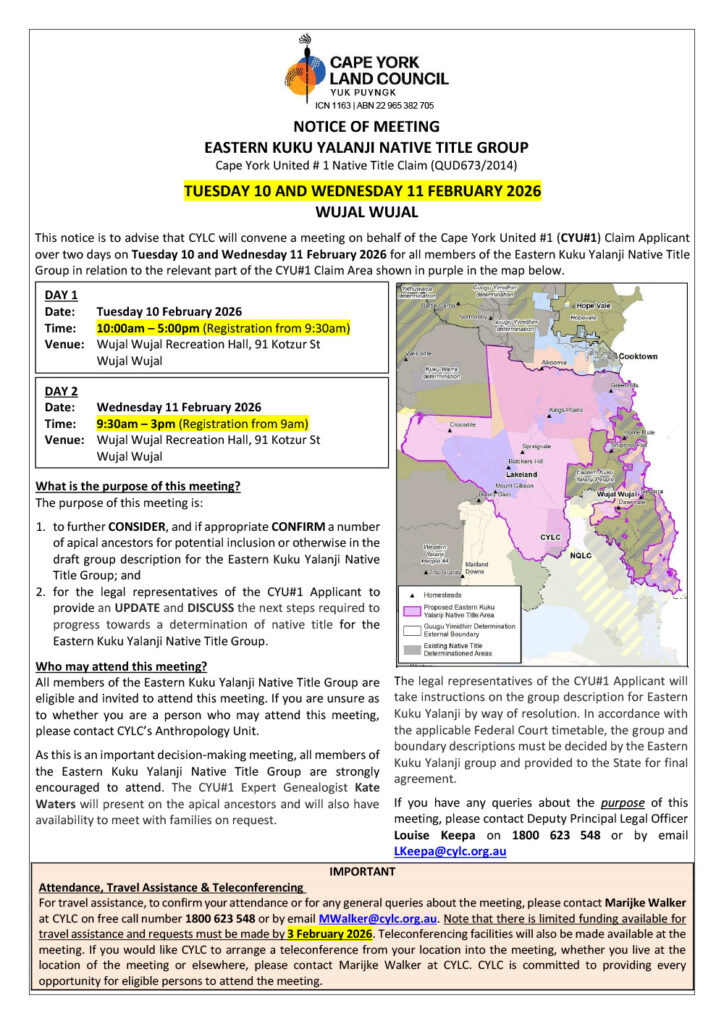 All members of the Eastern Kuku Yalanji Native Title Group are eligible and invited to attend this meeting. If you are unsure as to whether you are a person who may attend this meeting, please contact CYLC’s Anthropology Unit.
