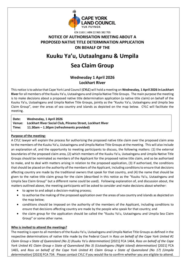 This notice is to advise that Cape York Land Council (CYLC) will hold a meeting on Wednesday, 1 April 2026 in Lockhart River for all members of the Kuuku Ya’u, Uutaalnganu and Umpila Native Title Groups. The main purpose the meeting is to make decisions about a proposed native title determination application (a native title claim) on behalf of the Kuuku Ya’u, Uutaalnganu and Umpila Native Title Groups, jointly as the “Kuuku Ya’u, Uutaalnganu and Umpila Sea Claim Group”, over the areas of sea country and islands as depicted on the map below. CYLC will facilitate the meeting.