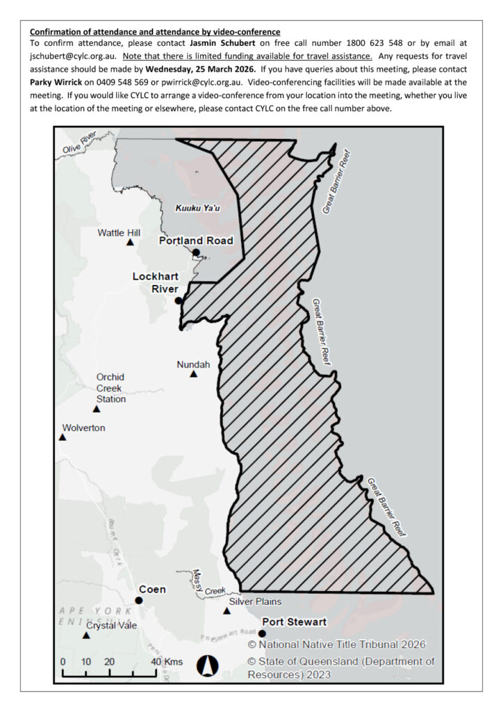 To confirm attendance, please contact Jasmin Schubert on free call number 1800 623 548 or by email at jschubert@cylc.org.au. Note that there is limited funding available for travel assistance. Any requests for travel assistance should be made by Wednesday, 25 March 2026. If you have queries about this meeting, please contact Parky Wirrick on 0409 548 569 or pwirrick@cylc.org.au. Video-conferencing facilities will be made available at the meeting. If you would like CYLC to arrange a video-conference from your location into the meeting, whether you live at the location of the meeting or elsewhere, please contact CYLC on the free call number above.