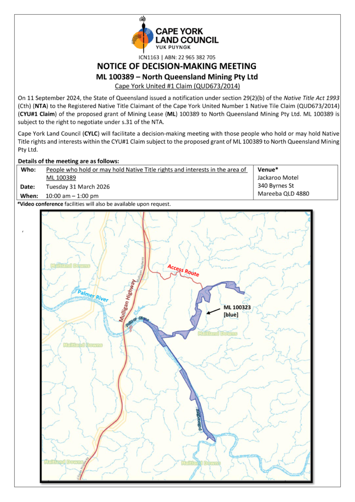 Cape York Land Council (CYLC) will facilitate a decision-making meeting with those people who hold or may hold Native Title rights and interests within the CYU#1 Claim subject to the proposed grant of ML 100389 to North Queensland Mining Pty Ltd.