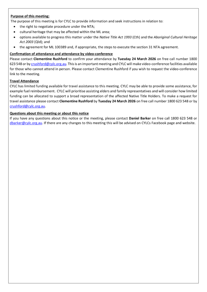 CYLC has limited funding available for travel assistance to this meeting. CYLC may be able to provide some assistance, for example fuel reimbursement. CYLC will prioritise assisting elders and family representatives and will consider how limited funding can be allocated to support a broad representation of the affected Native Title Holders. To make a request for travel assistance please contact Clementine Rushford by Tuesday 24 March 2026 on free call number 1800 623 548 or by crushford@cylc.org.au.