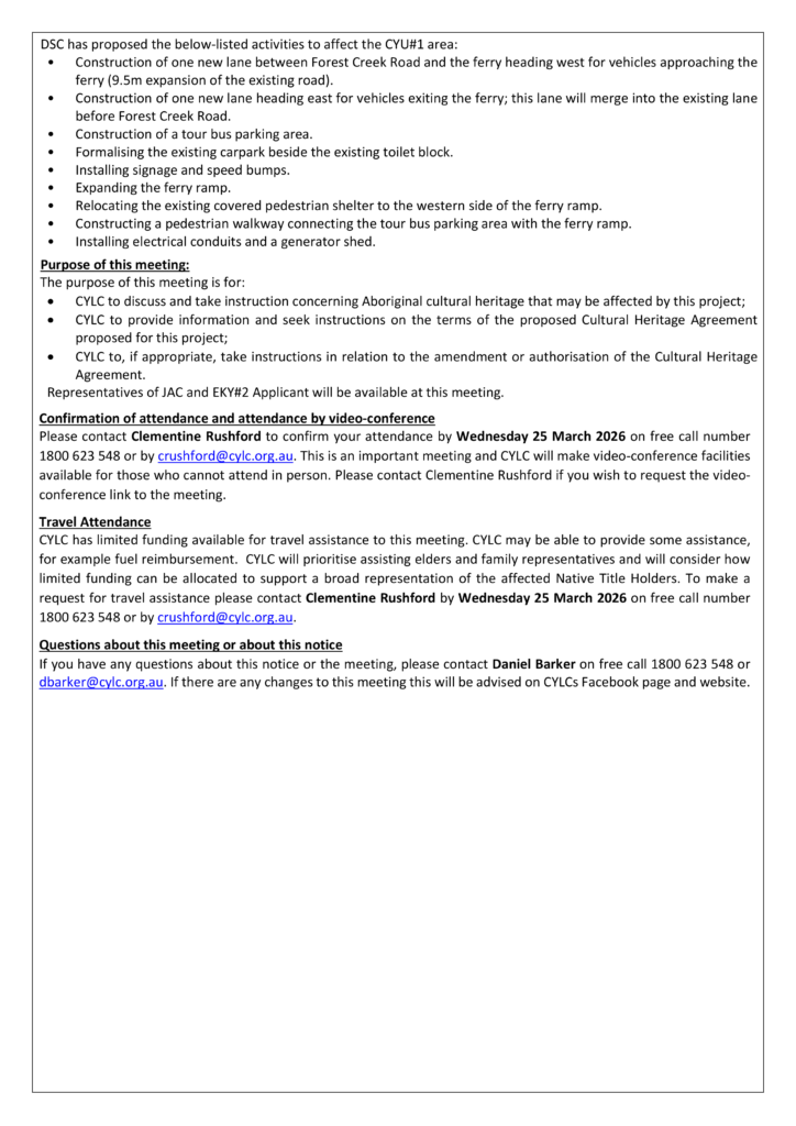 CYLC has limited funding available for travel assistance to this meeting. CYLC may be able to provide some assistance, for example fuel reimbursement. CYLC will prioritise assisting Elders and family representatives and will consider how limited funding can be allocated to support a broad representation of the affected Native Title Holders. To make a request for travel assistance please contact Clementine Rushford by Wednesday 25 March 2026 on free call number 1800 623 548 or by crushford@cylc.org.au.