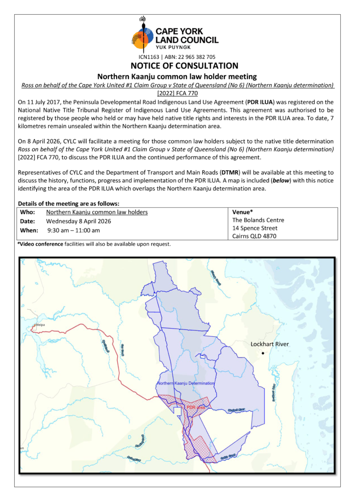 On 8 April 2026, CYLC will facilitate a meeting for those common law holders subject to the native title determination Ross on behalf of the Cape York United #1 Claim Group v State of Queensland (No 6) (Northern Kaanju determination) [2022] FCA 770, to discuss the PDR ILUA and the continued performance of this agreement.
