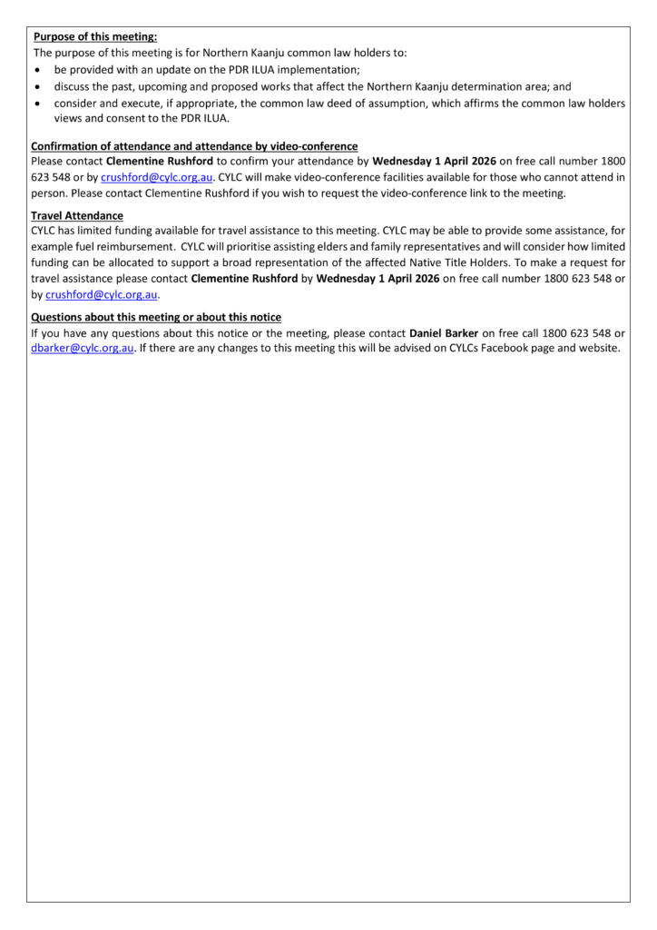 CYLC has limited funding available for travel assistance to this meeting. CYLC may be able to provide some assistance, for example fuel reimbursement. CYLC will prioritise assisting elders and family representatives and will consider how limited funding can be allocated to support a broad representation of the affected Native Title Holders. To make a request for travel assistance please contact Clementine Rushford by Wednesday 1 April 2026 on free call number 1800 623 548 or by crushford@cylc.org.au.