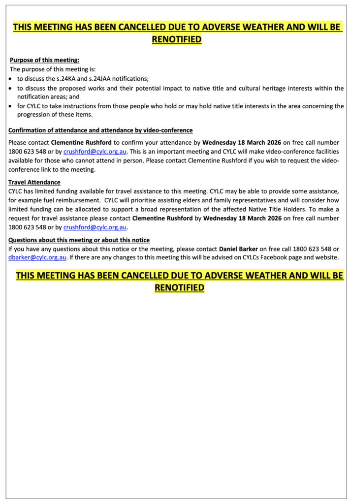 CYLC has limited funding available for travel assistance to this meeting. CYLC may be able to provide some assistance, for example fuel reimbursement. CYLC will prioritise assisting elders and family representatives and will consider how limited funding can be allocated to support a broad representation of the affected Native Title Holders. To make a request for travel assistance please contact Clementine Rushford by Wednesday 18 March 2026 on free call number 1800 623 548 or by crushford@cylc.org.au.