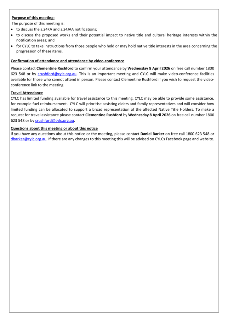 CYLC has limited funding available for travel assistance to this meeting. CYLC may be able to provide some assistance, for example fuel reimbursement. CYLC will prioritise assisting elders and family representatives and will consider how limited funding can be allocated to support a broad representation of the affected Native Title Holders. To make a request for travel assistance please contact Clementine Rushford by Wednesday 8 April 2026 on free call number 1800 623 548 or by crushford@cylc.org.au.
