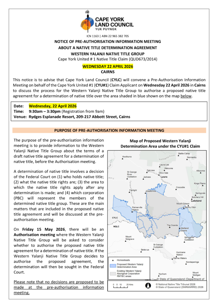 This notice is to advise that Cape York Land Council (CYLC) will convene a Pre-Authorisation Information Meeting on behalf of the Cape York United #1 (CYU#1) Claim Applicant on Wednesday 22 April 2026 in Cairns to discuss the process for the Western Yalanji Native Title Group to authorise a proposed native title agreement for a determination of native title over the area shaded in blue shown on the map below.