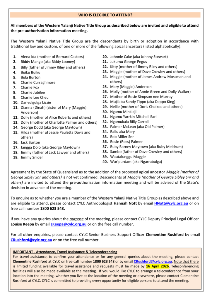 All members of the Western Yalanji Native Title Group as described below are invited and eligible to attend the pre-authorisation information meeting.